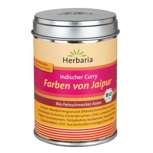 Herbaria Farben von Jaipur ist eine edle indische Curry-Gewürzmischung in bester Bio-Qualität für typisch indische Fleisch-, Fisch- und Gemüsegerichte. Diese besondere Currymischung mit Zutaten wie Kurkuma, Zimt, Kardamom und Ingwer, spricht alle Geschmackssinne an. Von süß, über fruchtig, leicht sauer, etwas bitter und einer milden Schärfe (Schärfegrad 2-3 von 10). Die Gewürzmischung Farben von Jaipur bringt den geschmacklichen Reichtum Indiens in die heimischen Küchen. Der Name wurde nach der indischen Stadt „Jaipur“, auch „Pink City“ genannt, gewählt. Wer Jaipur hört, denkt an Indien, seine einzigartigen Gewürze, Currys und die Farben des Geschmackes.