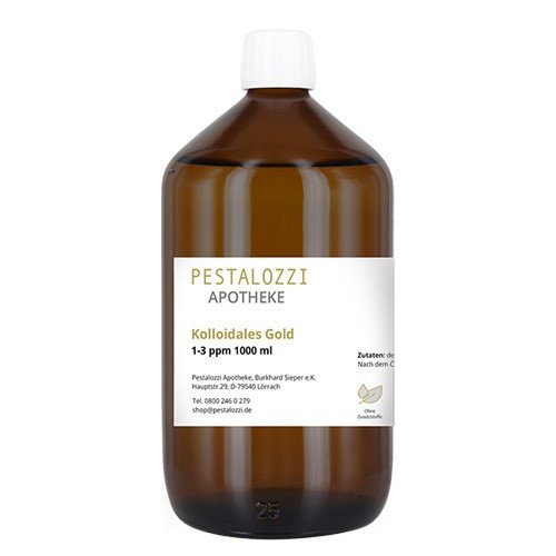 1 x 1000 ml "Kolloidales Gold - Pestalozzi Apotheke" in lichthemmender Apothekerbraunglasflasche